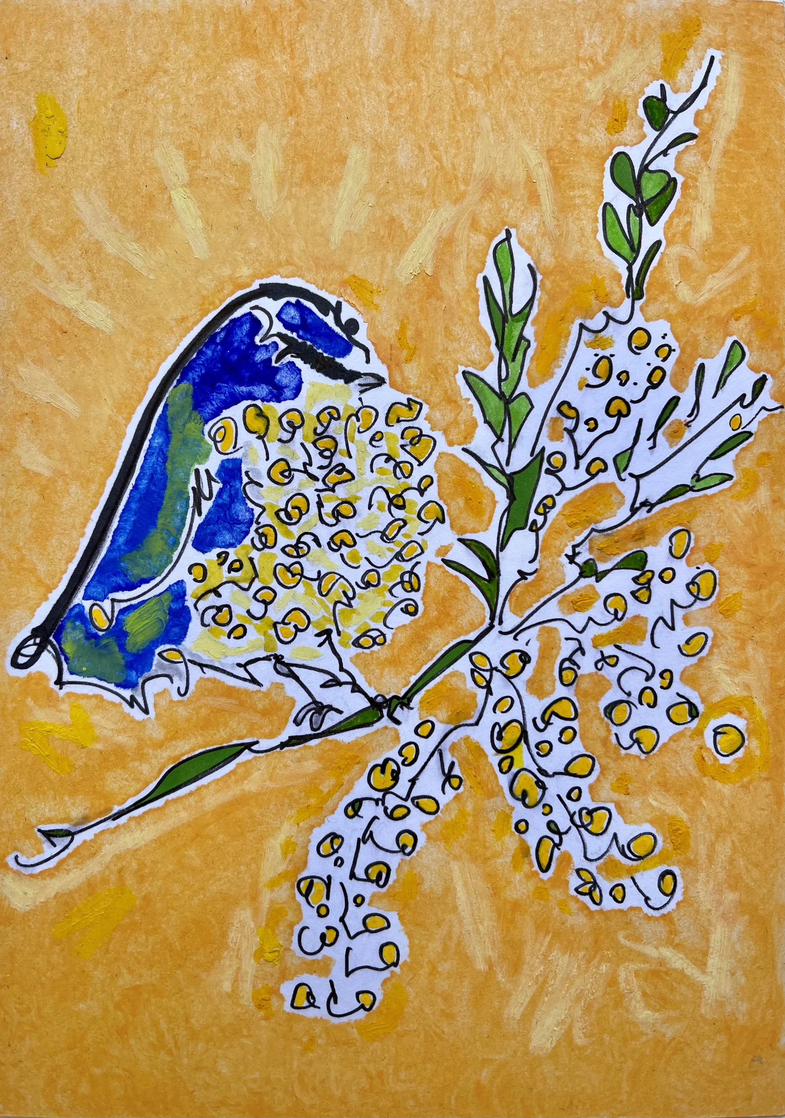 La mésange, traversée par l’éclat solaire, laisse éclore le mimosa, symbole de vitalité, de douceur et d’espoir qui rayonne bien au-delà d’elle-même.